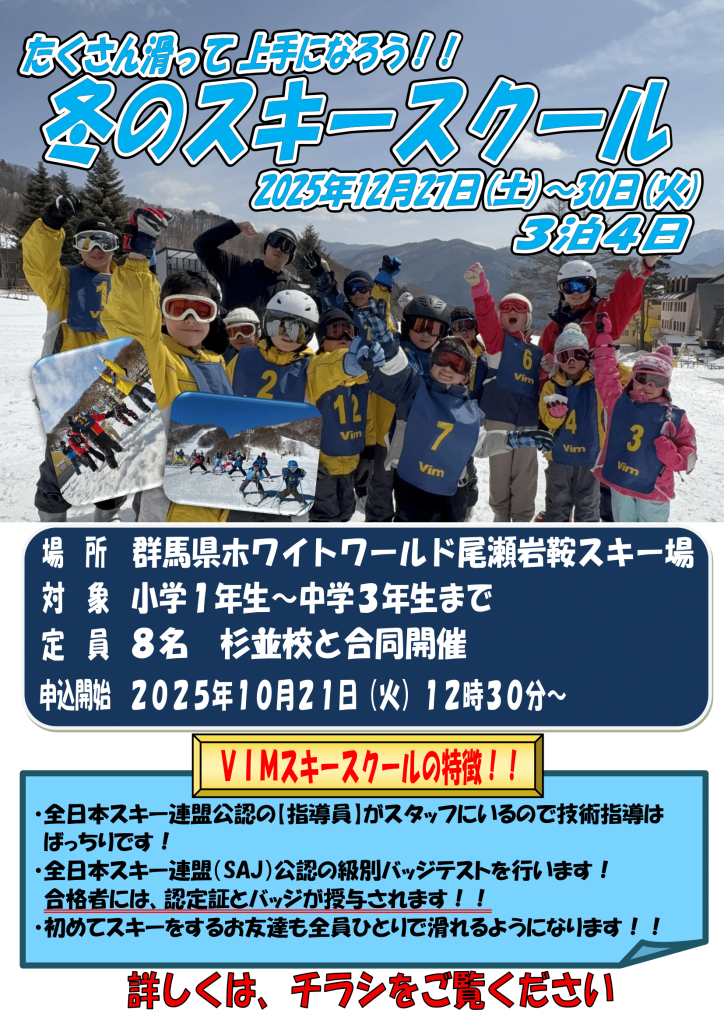 投稿日 2025/10/14 カテゴリー お知らせ(キッズスクール) 冬恒例!大人気イベント✨スキースクールに行こう~! 期 日2025年12/27(土)~12/30(火)対 象小学1年生~中学3年生定 員8名 杉並校と合同開催交通手段貸切観光バス宿泊施設ロッジかぶらぎ山どん申込開始10/21(火) 12:30~申込方法フロントにて参加費と保険証のコピーを添えてお申込みください(電話予約はできません) 詳しい内容はこちらをご確認ください