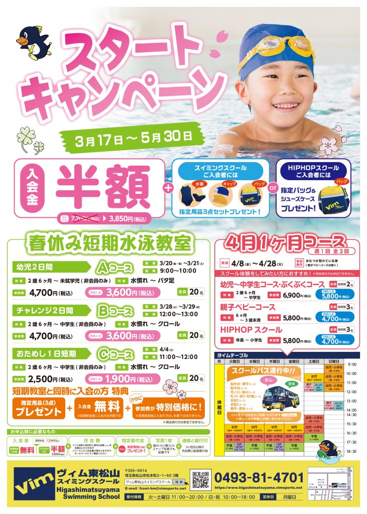 投稿日 2026/3/16 カテゴリー お知らせ(キッズスクール) 新学期の習い事はスイミングで決まり!キャンペーンでお得に入会できます。短期水泳教室も同時開催していますので、短期水泳教室でお試しも大歓迎♪