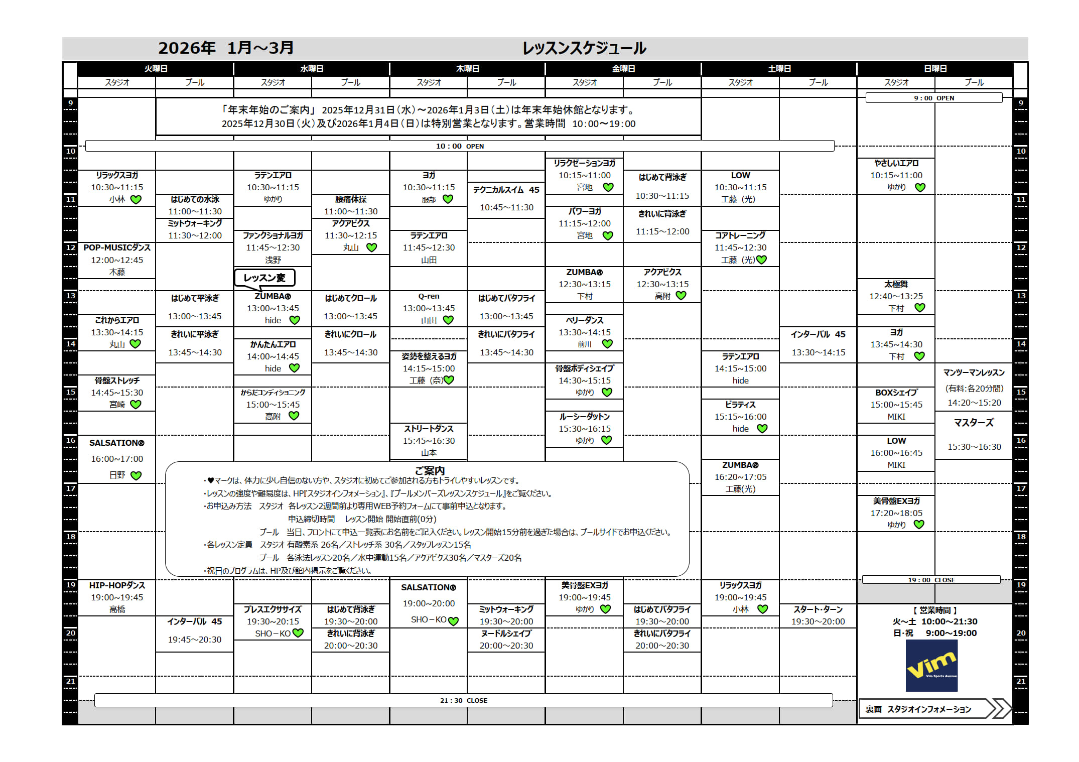 投稿日 2025/12/25 カテゴリー お知らせ(スポーツクラブ) ▶2026年1月~3月スケジュールはこちら ▶2026年1月~3月プログラム詳細はこちら ▶休館日 毎週月曜日 2026年1月1日(木)~3日(土) 1月31日(土) 3月31日(火) ※2026年1月4日(日)は特別営業(10:00~19:00)です。
