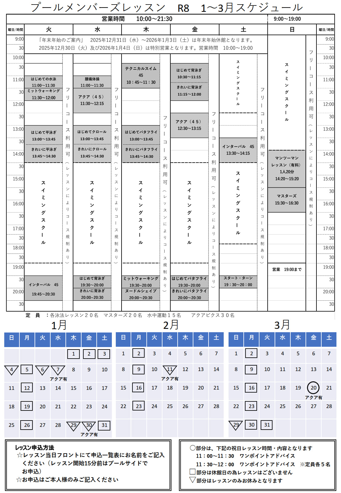 投稿日 2025/12/25 カテゴリー お知らせ(スポーツクラブ) ▶2026年1月~3月スケジュールはこちら ▶2026年1月~3月スイミングプログラム詳細はこちら ▶休館日 毎週月曜日 2026年1月1日(木)~3日(土) 1月31日(土) 3月31日(火) ※2026年1月4日(日)は特別営業(10:00~19:00)です。